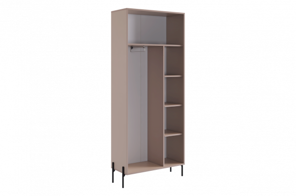 Шкаф "Доминика" оснащен глухими фасадами, скрывающими за собой просторное внутреннее пространство. На одной стороне шкафа находится штанга для одежды, обеспечивая удобное место для хранения одежды на вешалках.